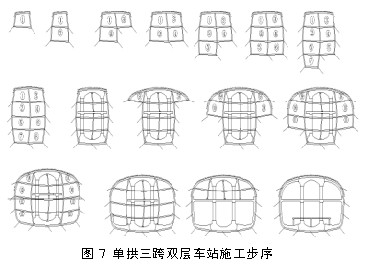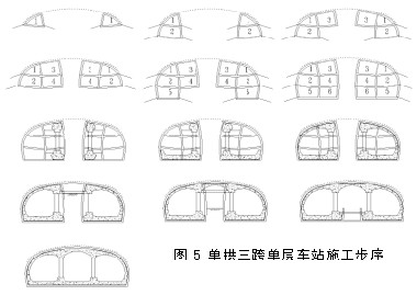 在地铁五号线采用明暗挖结合施工的车站,其暗挖部分均为下穿现状道路,以达到施工期间不中断交通的目的。为保证明挖和暗挖结构的合理埋深,暗挖部分均采用了单层结构。由于单层结构在分步开挖过程中的结构体系转换较双层结构简单、容易,同时又为避免连拱隧道顶部积水问题,推荐采用了单拱三跨结构型式。车站采用复合衬砌,顶梁、底梁采用钢筋混凝土结构,立柱为钢管柱。采用此类结构型式的车站有:刘家窑车站、东单车站、东四车站、张自忠路车站等。根据车站站台宽度不同,隧道断面尺寸大致在21.8m×9.5m(宽×高)~23.9m×10.5m(宽×高)左右。此类断面在北京乃至国内软土地层地铁车站中首次采用,施工可采用的方法与三连拱隧道基本类似,只是由于结构高度小,竖直方向的转换少,各施工步序转换更加简单、安全。此结构最大的优点是隧道顶部没有积水槽,防水效果好。此类工法的典型施工步序见图5