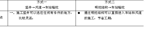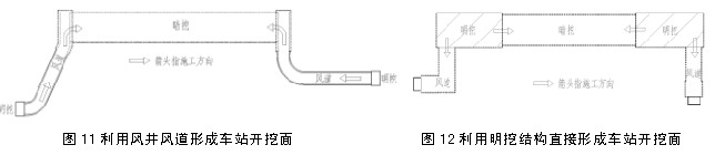 上述两种方式各有优缺点,但考虑到暗挖法车站往往制约整体工期,因此建议如果有条件,应尽可能采用方式二。还有另外一个方式也可以采用,即在利用风道形成车站开挖面的同时,将有条件的出入口作为车站上半断面的施工通道。由于出入口的结构断面小,施工期短,因此可以尽快进入车站,这样既可增加车站施工的工作面,也可以有效减少车站的工期和降低施工风险。