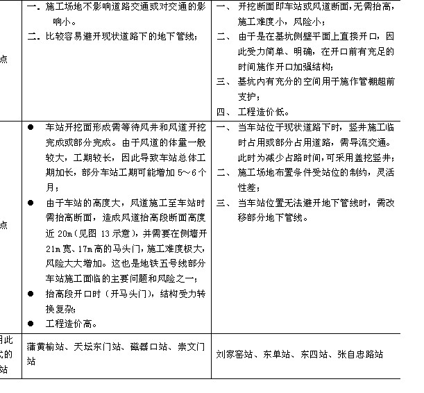 2. 要站在整个工程的高度选择施工方法,正确处理工程拆迁、工程造价、工期、环境影响以及社会效益等诸多方面的关系。地铁工程是一项浩大的城市建设工程,与城市的建筑、设施、环境以及人们的生活息息相关,必将对城市的正常生活造成影响,诸如拆迁房屋、影响交通等等。在城市的中心区修建地铁车站,不管采用明挖法还是暗挖法,工程拆迁都是不可避免的,虽然通常情况下明挖法的拆迁较暗挖法多,但我们应当综合多方面因素来选用合理的施工方法。综合费用的比较。采用明挖法的拆迁费+工程费是否低于采用暗挖法的拆迁费+工程费?如果明挖法的综合费用低于暗挖法的综合费用或两者相当,显然采用明挖法在经济上是比较合理的。否则,还要在其它方面进行考虑。 车站施工是否有条件促进规划实现。对于设在规划道路范围内的车站,一般应充分考虑道路规划建设以及能否通过地铁建设带动地面建设的开展。这样,本属于地面建设拆迁范围内的拆迁费用,可能变成由地铁和地面建设共同分担,既减少了地铁的拆迁费用,也减少了地面建设的费用,一举两得。这也是地铁工程建设带动沿线建设在这方面的体现,具有较好的社会效益。如果上述条件成立,那么采用明挖法或盖挖法是比较适宜的。环境影响和工程施工安全。采用明挖法由于占用的施工场地多,因此对环境的影响大于暗挖法。尤其车站位于现状道路下方,对地面交通影响较大。但是,暗挖法施工在安全方面却不能与明挖法比拟,在某些地段或者某种地质条件下,暗挖法施工难度极大,如果在车站上方或周围有建筑物,暗挖法施工引起的地面沉降较大,其负面影响不可忽视。 是否有重要制约条件。要考虑在站址周围是否有重要的控制因素,比如重要建筑物,重要文物保护单位,是否有重要且难以拆改的地下管线或地下构筑物等,这些控制条件往往影响到站位和施工方法的确定。工期是否充足够用。工程的建设周期长短也是一个不可忽视的因素,选择一种施工方法,要考虑到整个工程的筹划是否满足要求,不可忽视所选施工方法在安全性能方面的把握度,一旦出现问题处理时间是否可控,各方面的影响严重程度等。通过对上述各种因素综合、客观的考虑和分析,结合车站的综合技术经济比较,一定能够选取一种合理、恰当的施工方法。