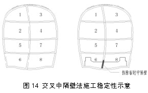 如果高度太大就必须增加台阶数量,导致初期支护不封闭段长度增加,风险加大。目前五号线采用比较多的工法是交叉中隔壁法,如图14示意,在开挖过程中,由于每一步都是封闭的,且为强支护,因此稳定性不会有问题。但在开挖完成后施作二次衬砌时,在局部拆除中隔壁和临时仰拱后,原先在开挖中已经形成平衡的初期支护受力体系受到破坏,如图14示意底部中隔壁拆除,竖向承载能力部分丧失,此时顶部的荷载无法靠中间的柔性临时结构承担,隧道将面临一定危险。当衬砌逐步向上浇筑,连续拆除中间临时结构时,风险越来越大。要减小衬砌和拆除过程中的风险,应尽可能减小纵向拆除隔壁的长度,利用空间受力效应保证隧道稳定,同时,应在拆除临时隔壁的部位,增设临时竖向支撑。由于大部分初期支护承受的是压力作用,当隧道断面较大时,建议将内部临时初期支护由弧形改为直线型,可以避免弧形初期支护在较大的轴力作用下失稳。