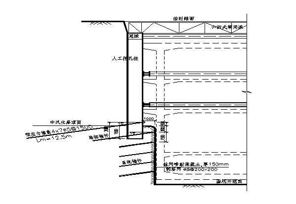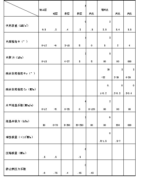 摘 要; 介绍基坑工程中组合式支护结构的设计方法 在基坑工程支护结构的设计中,当采用单一支护结构体系不能满足基坑支护的安全、经济及工期要求时,可考虑在同一基坑中采用两种或两种以上不同支护型式的组合式支护体系,如在基坑工程中经常采用的上部放坡或土钉墙+下部桩墙、上部桩墙+下部锚喷支护等。在广州地铁二号线江南西站南站厅基坑支护结构设计中,结合场地基岩面较高、起伏大的实际情况,在南站厅围护结构设计中采用了上部排桩+下部锚喷支护的阶梯型组合式支护结构,本文介绍了此类支护结构的设计方法以供探讨。一、概 述 广州地铁二号线江南西站位于江南大道与江南西路交叉路口以北的江南大道下,车站全长180.7m,呈南北走向。采用了站台与站厅分离布置的方式,站台层由两个矿山法施工的单跨单层马蹄形隧道组成,左右线间距28.2m,站厅及设备用房位于车站南北两端,为地下三层框架结构,南、北两个站厅规模相当,基坑开挖尺寸分别为51.3x18.2m、52.5x19.2m,基坑底面埋深24m。 车站所在路口西北角为二十层南海石油大厦,其北为高层住宅和南丰商场,东北角为多层住宅和邻街商业。沿江南西路南侧是海珠涌。由于江南大道为城市南北主干道,站址地面交通繁忙,为确保交通畅通,采用盖挖顺作法施工。其作业顺序是:先后分三次倒边作好外围结构,架设军用梁及路面盖板覆盖路面,之后恢复地面交通,在临时路面下方顺序进行土方开挖及车站主体结构的作业。 虽然南、北站厅的基坑规模、形式相同,但由于场地地层起伏较大,南站厅所处东湖段地层强风化带顶面埋深较浅,埋深只有8.3m~13.6m,北站厅所处西濠段地层强风化带顶面埋深较深,为26.6m~27.5m。针对不同的工程地质条件,在围护结构设计中因地制宜,分别采用了不同的支护形式。北站厅风化带埋深较深,采用直径1.4m、间距1.6m的排桩支护,南站厅风化带顶面埋深较浅,采用上部直径1.2m、间距1.5m排桩+下部锚喷的阶梯型组合式支护结构。二、地质概况(一)地貌、地层 场地原始地貌为残丘和平缓坡地,后经填筑平整为宽阔街道,车站南端临海珠涌,地表普遍为厚0.2m的水泥路面。本站场属白垩系红砂岩地层,基岩主要为泥质粉砂岩,局部为泥岩、泥灰岩。基岩面起伏较大,南段东湖段地层强风化带顶面埋深8.3m~13.6m,北段西濠段地层强风化带顶面埋深26.6m~27.5m。两岩段强度差异大,其中东湖段地层岩石较软,西濠段地层含钙质较多,强度相对较高。场区内未发现断层破碎带,岩石裂隙不发育。(二)工程地质分层(1)人工填土:主要为杂填土,层厚1.0~7.2m之间,较常见为2.5~4.0m。(2-2)淤泥层:为灰黑色淤泥质土,土质较均匀细腻,粘性强,下部常有粉细砂,主要分布在海珠涌及其两侧附近。(4-1)冲积粘性土层:红白色粉质粘土,软~可塑。层厚0.5~9.5m,顶面埋深1.0~5.9m。(4-2)冲积砂层:灰~灰白含粗砂、砾砂、中细砂。层厚0.5~1.6m,顶面埋深5.0~7.1m。(5-1)残积可塑土层:棕红色粉土、粉质粘土,可塑,砂质含量高,风化透彻。层厚0.9~14.1m,顶面埋深1.7~10.5m。(5-2)残积土硬塑层:为紫红~灰色粉质粘土、粘土,粘性差,硬塑。层厚0.5~7.6m,顶面埋深5.1~20.3m。(6)全风化带:全风化泥岩、粉细砂岩、砂岩、砂砾岩。原岩矿物大多风化成土。层厚0.5~8.2m,顶面埋深7~23.5m。(7)强风化带:强风化泥岩、砂岩、泥质粉砂岩。场区普遍分布,层厚1.2~23.5m,一般厚度为1.4~4m。顶面埋深6.4~27.5m。(8)中风化带:中风化泥岩、砂岩、泥灰岩。岩石裂隙不发育,完整性较好,较硬。本层分布广,厚度变化大。层厚2.0~17.6m,顶面埋深7.7~31.5m。(9)微风化带:微风化泥质砂岩、泥岩、泥灰岩。岩石完整性好。层顶面埋深17.5~34.5m。 本工程场地基岩强风化岩风化裂隙发育,但延伸短,产状杂乱,裂隙面多有泥质、钙质充填及铁锈质渲染;中~微风化岩石裂隙较发育,主要为倾角5°~30°的缓倾角裂隙,少量中等及陡倾角裂隙,裂隙面多充填钙质薄膜,沿裂隙面岩层易开裂成块状。岩层产状受珠江向斜构造的控制,岩层往北倾斜,倾角5°~35°。(三)水文地质 地下水有孔隙水和裂隙水 两种。孔隙水主要储存于第四系地层中。土层透水性差,富水性差,水量较贫。地下稳定水位埋深为2.2~6.0m。基岩裂隙水贫乏。地下水对砼无侵蚀性。(四)工程地质评价 本站场地质条件简单~较简单。各土层物理力学指标三、车站南站厅基坑围护结构方案 南站厅围护结构,对于中风化岩层以上的上覆土层,围护结构由排桩及钢支撑组成,下部的中风化岩层边坡采用锚喷支护。 车站位于交通繁忙的江南大道下方,围护结构的施工要尽可能减小对地面交通及环境的干扰。根据广州地区的工程实践经验,人工挖孔桩具有刚度大、布置灵活、施工器具简单、占地面积小、噪音及费用较低等优点,因此站厅基坑排桩采用人工挖孔灌注桩。排桩桩径1.2m,护壁厚0.15m,桩间距1.5m,桩身插入中风化岩2m。根据排桩围护的基坑深度,分别设置2~4道Φ600钢管支撑,钢管壁厚14mm。由于上覆土层中有淤泥及细砂层,地下水与海珠涌相联系,因此在排桩外侧设置一道定喷(摆喷)桩,起到基坑外止水帷幕的作用。 下部基坑的锚喷支护由系统锚杆及喷射混凝土组成。系统锚杆采用φ22@1.5mx1.5m的