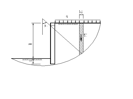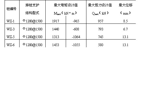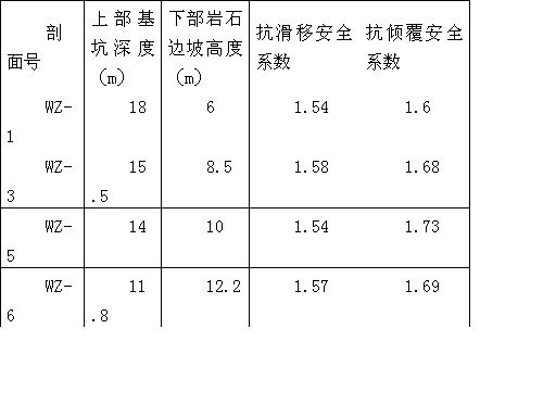 水泥砂浆锚杆,锚杆长3m,倾角15°,钻孔直径40mm。对于岩石破碎地段或软弱夹层及桩前岩石采用5m长φ22@1.5mx1.5m锚杆进行加固。C20喷射混凝土厚度0.15m,钢筋网采用φ8@200mmx200mm。围护桩根部设置一道4x7φ5间距1.5m的预应力1860级高强锚索,倾角15°,钻孔直径130mm。预应力锚索锚固段长度12.5m,自由段长度4m。由于岩石边坡顶部拉应力的存在,顶部易出现拉伸裂隙,因此在桩脚处设置5m长φ22@1.5mx1.5m锚杆进行加固,以加强岩石边坡顶部的支护结构。四、围护结构设计中需要解决的问题 阶梯型组合支护结构是在基坑侧壁上、下分别采用不同的支护型式的结构,各支护结构分别按单一的结构进行设计。随着基坑的开挖,支护结构体系发生变化,因此上、下部支护结构单元除了满足按单一结构作用的条件外,还要考虑各支护结构单元的相互作用。计算下部支护结构的荷载时,应考虑上部支护结构及后侧土体的超载作用。(一)排桩入土深度确定 一般支护结构入土深度必须满足墙体抗滑动和抗倾覆稳定、坑底隆起稳定以及坑底抗渗流稳定的要求。本工程上部基坑围护结构型式为设置2~4道支撑的多支点排桩,桩端均插入中风化岩层中,基坑底面为厚度较大、较均匀的中风化岩层,基坑失稳形态以由于桩底岩体发生剪切破坏造成基坑整体滑动失稳为主,因此采用圆弧滑动简单条分法确定入土深度。假定基坑失稳的滑动面为圆柱面,按平面问题进行分析,将滑动面以上土体等分为n个土条,根据极限平衡条件求得土体对滑动面原点O的抗滑力矩与下滑力矩,抗滑力矩与下滑力矩之比即为稳定安全系数K。Wi — 第i土条的重量;q — 作用于第i土条上的地面超载;ci ji— 第i土条滑动面土层的内聚力、内摩擦角;θi — 第i土条弧线中点切线与水平面夹角;li bi — 第i土条的弧长、宽度。 根据基坑开挖深度、支撑体系、岩层风化程度,结合广州地区类似工程经验,初步拟定排桩嵌入中风化层2m,按总应力法求得基坑稳定安全系数K如下表: 在军用梁、临时路面、地面超载及桩身自重等竖向荷载作用下,桩底压应力为1038kPa,小于岩石地基允许承载力。为防止桩底泥岩遇水软化,避免地下水沿桩与岩土的界面渗入桩底,在排桩外侧设置一道摆喷桩止水帷幕。(二)排桩支护结构计算 多支点排桩的受力与基坑开挖过程和架设支撑的时间、顺序有密切关系,支撑架设之前排桩已经产生了先期位移和内力。如采用等值梁法简化计算,其假定条件与排桩在施工过程中的受力情况不符,因此采用弹性地基梁杆系有限元法,根据施工顺序分阶段按增量法原理进行内力计算。 取1m宽度支护结构按平面问题分析,排桩在基底以上部分采用梁单元,基底以下部分作为文克勒弹性地基梁,将基坑开挖面以下土体视为弹性变形介质,其水平基床系数按m法确定,并在计算中对土弹簧刚度取值加以限制,最大值不超过实际工程勘察结果。支撑按弹性支座考虑。施工期间排桩背侧的主动土压力按朗金公式计算,土压力随基坑开挖深度增加逐渐增加,对地下水位以下的土体采用总应力强度指标水土分算。 根据实际施工顺序将每一开挖阶段作为计算工况,每一工况需考虑前后工况土压力的增加量以及位移增量,当前工况下的实际内力和位移为与前几步工况内力和位移增量的累计值。此种计算方法反映了土压力随基坑开挖深度增加逐渐增加的实际情况,在计算中计入结构的先期位移值以及支撑的弹性压缩,符合先变形、后支撑的实际施工工况。为减少桩身在基坑开挖期间的位移,对钢支撑施加设计轴力50%的预应力,在计算中考虑支撑预应力的作用。排桩内力、位移计算结果整体稳定性计算结果排桩结构的构件按其在施工和使用的不同阶段可能出现的最大内力进行截面设计。内力设计值按下式确定:M=1.25γ0MuM —— 单桩桩身弯矩设计值;Mu—— 按土压力强度标准值计算的桩身弯矩标准值;γ0—— 基坑侧壁重要性系数。 排桩钢筋配置按弯矩方向采用沿圆周非均匀布置,将圆截面同刚度等代成矩形截面(b = h = 0.876 d ),按《混凝土结构设计规范》中矩形截面受弯构件承载力公式计算。如WZ-1桩弯矩设计值为1917 kN·m(-995 kN·m),等代成矩形截面按受弯构件计算出受拉钢筋面积As=6905mm2(As=3376mm2),实配钢筋13Φ28(9Φ28),分别在正负弯矩方向受拉区(约120°范围)内按计算结果布置钢筋,其余部位按构造要求配置钢筋。(三)桩前岩体开挖后排桩支护结构分析 桩前岩体开挖后,由于失去被动土压力,结构受力体系发生变化,因此需对排桩支护结构体系进行结构计算及稳定性分析。1. 排桩支护结构计算 在原支护结构体系的基础上增加锚索的水平支撑力,并去掉被动区水平方向的土弹簧,仍采用增量法计算支护结构的内力与变形。求得锚索最大水平支撑力标准值为280kN/m,并按下式确定锚索锚固段长度为12.5m。根据岩体可能发生的破裂面确定锚索自由段长度为4m。N ——锚杆轴向拉力设计值;D —— 锚杆锚固体直径;Lm —— 锚固段长度;τ —— 岩体与锚固体间极限摩阻力标准值2. 抗滑移稳定性验算排桩的抗滑移稳定性按下式验算:G —— 桩身自重μ——桩底与基岩的摩擦系数,对于软质岩石取0.4~0.6Ti —— 各支点水平力标准值Eai —— 各土层主动土压力3. 抗倾覆稳定性验算 各土层主动土压力Ea,各支点水平力标准值Ti作用下,对桩端B点的力矩比需满足下式:(四)岩石边坡稳定性分析
