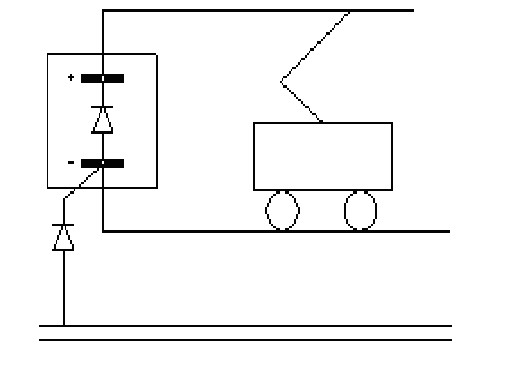 为了减少从钢轨泄漏至地下的杂散电流对金属导体产生的电化学腐蚀,最早的做法是采用直接排流方法;即将牵引所附近的金属导体与牵引所内负母线直接相连,在金属导体与负母线之间形成很小的电阻通路,这样从钢轨泄漏至地下的杂散电流在进入地下金属导体后,由于这部分杂散电流是沿着导体电阻较小的通路流回牵引所负母线,而不是先流出导体进入土壤,而后从土壤进入网轨,从而避免了对牵引所附近金属导体的腐蚀。这种排流方法,称之为直接排流法。如图4。