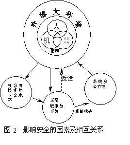 从系统论的观点出发,影响安全的诸多因素可以归结为人、机、环境和管理。早在40年代后期,美国康耐尔(cornell)大学的T.P.Wright就提出,按人、机、环境分类是检查事故起因和事故预防机理的理性模型。1976年,纽约工业学院的E.J.Cantilli等人揭示了以管理为边界的人、机、环境之间的关系,如图2所示。