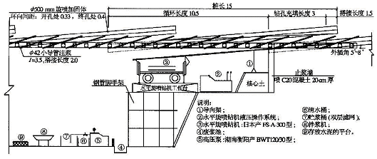 封闭上台阶和下台阶工作面,喷混凝土厚度不小于20 cm , 精确测量中线、水平,搭设工作平台,平台上铺设竹夹板和枕木,将钻机、高压泵及其他机具一字排列就位。设置临时边沟及废浆池。