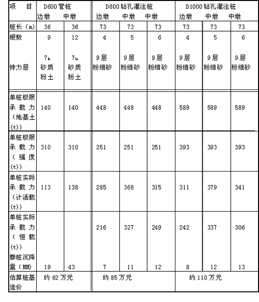 经多方案的比选,基础设计采用直径1米的钻孔灌注桩,桩尖持力层选择⑨层粉细砂,桩长73米,计算沉降量中墩8毫米,边墩12毫米,方案比选详见表2。为保证长桩的施工质量,设计时在桩顶特设了2米长的钢护筒,施工时加强监测,严格控制桩底沉渣层厚度。