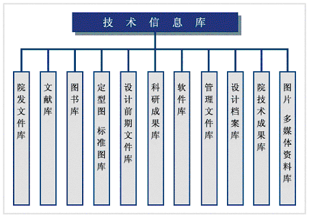 技术信息库主要包括:院发文件库、文献库、图书库、定型图标准图库、设计前期文件库、科研成果库、软件库、管理文件库、设计档案库、院技术成果库、图片多媒体资料库。