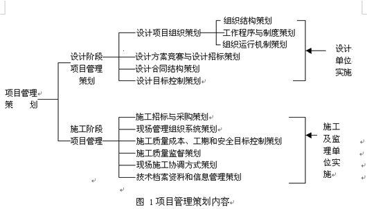 项目组织策划指建立工程项目法人责任制(即项目甲方),按现代企业组织模式组建与项目建设有关的管理机构及人事安排;融资策划即为实现项目建设提供资金保障;目标策划即制定项目投资目标、质量目标和进度目标的体系设定与实现;项目管理策划是对项目实施的任务分解和任务组织工作的策划,着力于提出行动方案和管理界面的设计。