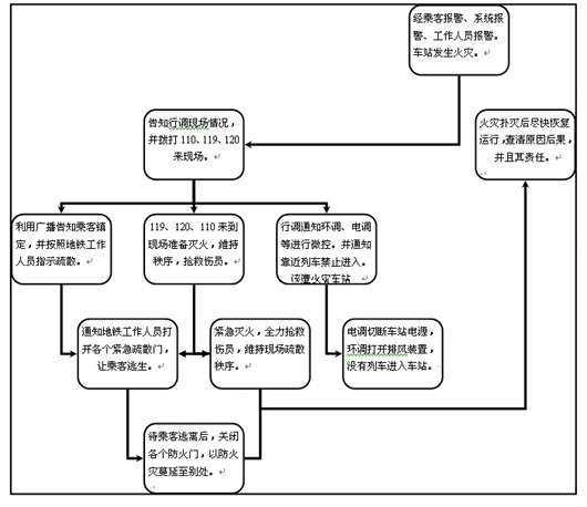 以上说明了火灾的危害性。我们从事地铁运营相关工作的工作人员,身负防火救援的重要职责,在地铁发生火灾时,应当怎样去做呢?当然是依照一定的处理程序来进行。决不允许在地铁发生火灾时,列车司机先逃生,将乘客们滞留在列车中的现象出现。韩国大邱市的地铁火灾虽是有人故意放火的,但司机见列车发生火灾竟然不顾乘客的人身安全,自己逃生。致使造成了124人死亡,144人受伤,279人失踪的重大事故发生。司机的不负责任当然是要受法律制裁的。所以列车司机在列车发生火灾时充当了紧急救援的重要角色。下列是特大和一般火灾发生在车站的救援处理工作程序: