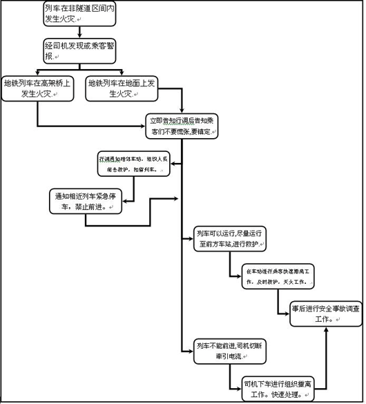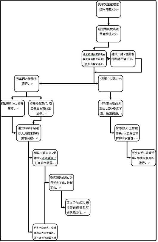 以上便是其中两种情况下的火灾处理程序。平常,我们还须注意火灾的根源。即可以有效的防止火灾,才是最最重要的。下面是列车火灾发生在地面区间和高架区间的处理程序: