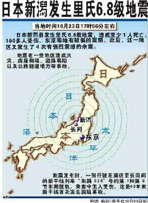 在10月23日我们到达东京市区,吃晚饭的时候正赶上新泻县(东京以北200公里)发生了里氏6.8级地震,在东京湾温暖的怀抱里,摇摇晃晃的餐厅好像母亲在轻轻推动着婴孩的摇篮,而这是我人生中第一次体验大地的颤抖是什么感觉。晚上在酒店看新闻(呵呵,日本电视新闻好多汉字,还有英文报纸)才得知“这次地震始于当地时间星期六下午5时56分”,并且“地震发生时,一列行驶在浦佐至长纲间的新干线列车出轨,这是40年来新干线的第一次出轨”(后来得知这列车叫朱鹮325号,出轨的是1号和9号车厢,无乘客死亡)。我想,这可能算是轨道交通安全运营方面的重大事故了,不知道媒体会如何去报到此次事件。后来的几天里面,我有意关注了新闻里面这方面的消息,看到了媒体非常客观地报到地震灾区的情况,而新干线的修复情况,记得是大概第6天(10月29日),就看到那列车被工人们“拉”到了正常轨道。