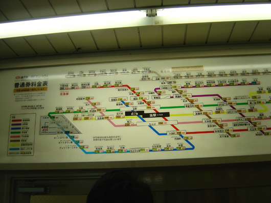 车票有一票到底的,就是买一张车票可以跨越任意个不同运营商的不同线路而不用更换车票。也可以按照自己的需要多买几次的分程票,当购买的票数超过10张,还可以选择“回数券”即赠票(买十赠一)。车票看起来是一张硬卡纸,但我想是磁信息记录,进站出站和换线路的时候检票机会确认其中的有效信息。且票价是根据路程的远近而变化,非北京地铁类似的一票制。有意思的是,有一次大家看到了一张票价图标注的从此站到各个站的价格时,发现了有蓝色和红色两种标注,仔细看英文的注释才知道,红色的是儿童票,基本上是蓝色成人票的半价。