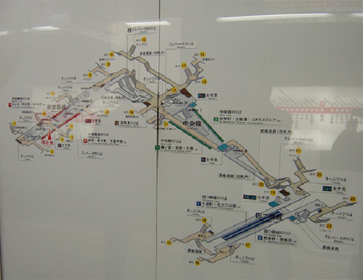 第二天下午我们曾从东京的新宿地区地面上的一个长长的甬道走下去,因为BILLY说,这里就可以到地铁站了(日本的地铁“站”字用了一个汉字中比较古老的字“马尺”,因为找不到这个字,只好还写成站)。而当我们走入地下后,眼前是匆忙的人群,明亮的商铺和长长的步行通道。在四通八达的地下空间里面,我们按照墙上地形图的指示,走了约2分钟,看到了第一个指示进站的牌子和一些自动售票机以及闸机;继续往前走再有3分多钟,看到了另一个进站口,仔细看看,是另外一条线;而再往前走还能找到新线和新站。这对我这个只坐北京1、2号线习惯了不出站换乘的人来说感到非常惊讶,而后来高木先生领我们做四通八达的各种东京轨道交通的时候发现此种情况非常普遍。