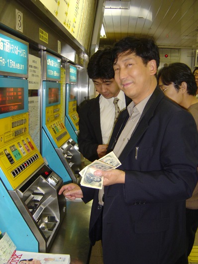 东京地铁的票务系统给人很深的印象。由于日本的人工费用很贵(据BILLY介绍,一个刚参加工作的大学生月薪基本上是25万日元左右),所以地铁站里到处都是电子售票机。但买票丝毫不会因为电子售票而麻烦,我们在高木的指导下,每次买票都自己动手,先放入炒票(纸币和硬币均可),然后只需要按下触摸屏上显示的票价、张数,售票机迅速地吐出票和找回的钱,而且找回的钱不仅有硬币,超过500以上纸币也飞快吐出。
