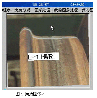 图像源的采集可分为模拟信号输出和数字信号输出,前者需要图像采集卡、A/D模数变换模块等,它能进行远距离的传输。而目前随着数字技术的发展,图像采集简便化,只要一个CCD数码采集单元和一个配套的驱动程序,使用上非常方便。但传输距离比较近(调试),需要靠无线来传输图像,其结果图像噪声较大。本项目的车轮外形磨耗自动检测系统,其车轮图像的采集由CCD摄像机、PCI采集卡和辅助光源来完成,将采集到的图像数据直接传递给计算机。在本软件中集成了图像捕捉功能,设定一个监视区域,能自动捕捉目标并自动保存,不需要复杂的传感器。图2是现场采集到的彩色原始图像,捕捉到的图像清晰度是后期图像处理的关键。要求车轮图像的背景噪音与车轮轮廓具有明显的不同。在试验中增加滤色片,其效果非常满意,能过滤不同的背景噪音。通过反复对实际图像处理的结果。