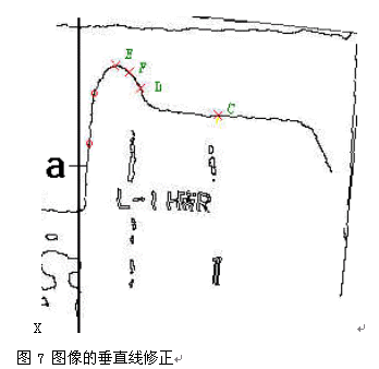 图像的自动识别是以车轮的内侧面为基准线进行的,因为车辆在以5km/h速度运动进入停车库时,由于轮轨之间存在间隙,车轮轴可能产生左右轴向偏移,采集的图形其实际内侧面与理论面基准垂直线产生一定角度a,图像不一定垂直理论基准垂线,为此,重点研究了如何能自动识别其垂直度的算法,即能对图像进行自动的扫描,对图像不断进行判断(旋转),修正车轮内侧面基准线的垂直位置,最后使图像的内侧面基准线与理论设定的X轴垂直,如图7所示。