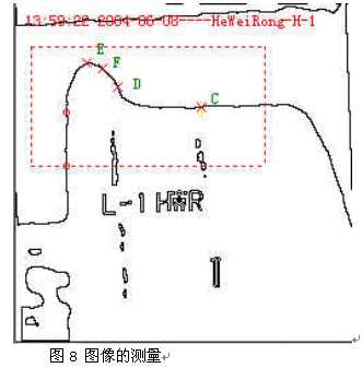 经过图像修正后得到如图8,我们选择好各个参数和识别的区域,如车轮内侧面至70mm处为车轮的直径测量点和识别区域(红色虚线),计算机便自动在这个区域内对所有图像进行几何尺寸的计算,每幅图像基本在这个区域内,计算机便自动测量并保存数据,最终得到如图8的图像效果,C点为车轮直径值(距离车轮内侧面70 mm处),D点为车轮轮缘宽度值(距离车轮C点10 mm处),E点为车轮轮缘高度值,并且将所测的数据保存在数据库内,建立纯文本文件(TXT)和数据文件(DB)以及动画文件(AVI),记录48个车轮测量得到车轮数据以及动态图像录像。