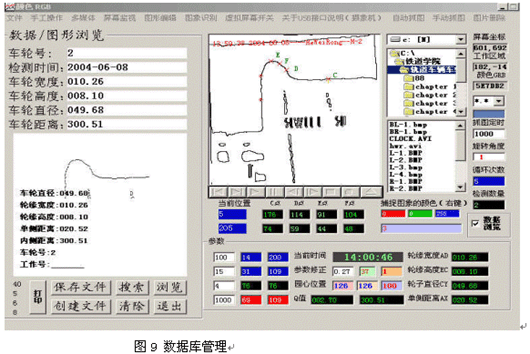 为了将检测到的数据进行分析和保存,本软件设计了动态数据库,如图9。通过对每幅图像的六大处理后,测量的数据分别保存在数据库内和文本文件中,用户可以方便搜索。对不符合要求的数据用红色显示并通过计算机RS232串行接口传输到设备中的指示灯显示,提醒人们该车轮已超值。在软件人机界面中,我们通过设定各类参数如: