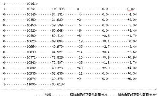 此外等边导线具有两个重要规律:即满足两个公式(③和③’)。③’为等边导线所特有,也可用于检验等边导线观测值是否含有粗差。③是所有导线具有的规律,归化改正数的残差向量也符合这一规律,所以③除能检验观测值是否含有粗差外,还可以检验归化改正结果是否正确。