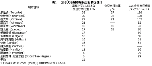 1991-1992 年由加拿大大都市统计区出行方式调查资料 , 见表 1.