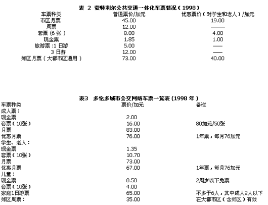 第二次世界大战以后,多伦多是世界上首批兴起大众分级交通体系的城市之一 .二战期间 ,石油实行配给制, 政府投次的 Yonge 地铁线 Union 站至 Egliton 大街段于1954年建成 .60年代中期 ,Bloor-Danforth 地铁线完工, 接着 1980 年向东延伸到 Kennedy 路, 向西延伸到 Kipling 大街 . 整个地铁系统有 59 个车站 , 线路总长超过 97.3km . 预计到 2001 年将建成东向 Sheppard 支线 . 蒙特利尔首期地铁线 1966 年开通, 现在地铁系统有 3 条主干线和 65 个车站 64km. 多伦多和蒙特利尔实行轨道交通和公共汽车一体化车票 , 分别由他们的城市交通委员会 (TCC 、STCUM) 统一 管理 .表 2、3 列出了城市公交网络的车票种类和票价 .