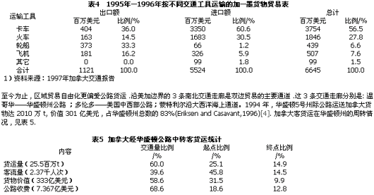 交通走廊与经济的活动的联系密切 .随着贸易自由化和全球化的浪潮的兴起 , 重建加拿大交通走廊的非常必要的 。1978 年加拿大制定了公路货运条例 ,1991 年被美加贸易协定所取代 , 1994 年又扩大为北美自由贸易协定 (NAFTA)[2]. 显然 , 这些协定对加拿大的交通走廊的变化产生重要影响 .首先 , 过境货运量增加; 其次 , 东西交通轴向弱化,而南北区域交通走廊得到强化。1988 一 1995 年期间 , 从过境交通中所获得的收益几乎翻番, 从 16 亿美元增加到 31 亿美元 , 年均增长 11%, 而且 , 美加之间的货运交通已成为公路货运行业增长的主要因素 .1995 年过境货物量达 4300万 t, 比 1994 年增加 29%.1996 年美加贸易中公路运输比例占 67.3%, 几乎是铁路货运(比例为17.5%)的4倍[3]。虽然加拿大和墨西哥的贸易额远远低于美加,但是通过公路运输的进口货运量也显著增长。表4是加拿大和墨西哥之间贸易情况