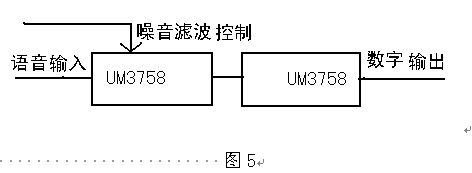滤波功能是自动识别(阻挡)我们在设计阶段设计好的各个工况的语音情况,例如:司机的讲话及车辆杂音等(在麦克风的工况下),以确保输入语音的可靠性、稳定性,特采用UM3758串行编译码一体化进行滤波电路。如图5。