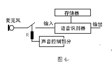 通过麦克风或(结合器)连接,如图4所示,要求模拟语音输入点的电压必须控制在大约20mv左右,以确保后期语音识别的正确性。在输入电路中增加了声音控制部分的电路,即将模拟信号转变成数字方波信号,对语音输入进行开关量的控制,确保在T<0.9秒内的正确输入语音字长。