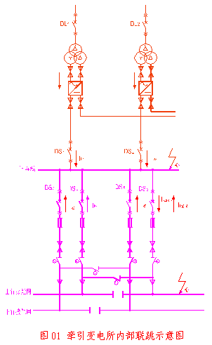 牵引变电所内部联跳的定义:当发生短路故障引起两台整流机组直流引入断路器或交流断路器同时跳闸时,应迅速跳掉全部直流馈线断路器,以及时切断电源。见图(01)