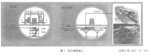 (6)先行通梁。在完成了扩挖施工的辅助准备工作后,开始着手进行隧道内的扩挖施工。首先施工隧道间的先行通梁,先行通梁的作用是:连接两条隧道,增加隧道间的刚度;初步分割开挖面,降低开挖风险;提高下部土体的强度,起到一定的抗浮作用。先行通梁采用小顶管工法施工,通过顶管机在一侧隧道内将直径约 350mm的钢管顶入另一侧的隧道,从而连接两条隧道,见图 7。