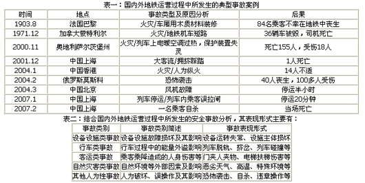 我国地铁运营自1969年北京地铁1号线运营伊始,经过近40年的建设和发展,截至2008年,全国将开通运营地铁的城市有北京、天津、上海、广州、深圳、南京等六大城市,共22条线路。未来十年,除现有地铁城市的新线开辟外,另有沈阳、哈尔滨、杭州、苏州、成都、西安等六座城市已经获批准正在开工建设,还有一些城市正在规划发展地铁项目。目前我国轨道交通的发展规模和速度在全世界都是史无前例的,由于建设规模比较大、建设速度比较快,当前已经出现了一些值得高度重视的问题,存在建设和运营技术力量不足、高端人才和富有经验的技术骨干缺乏的现象;一些地铁项目上马后急于交付使用,建设周期太短,很多线路存在边设计、边勘测、边施工、边运营的现象,抢工期、抢进度问题比较突出,由于工程质量、人员意识、设备技术和整体环境情况等问题,难免存在一些薄弱环节和安全隐患,往往成为事故的诱因,给运营安全管理无形中增添了难度,已有不少地方的地铁在运营过程中发生了安全事故,造成人员伤亡和经济损失。为了促进我国地铁建设又好又快发展,确保地铁运营安全是至关重要的课题。