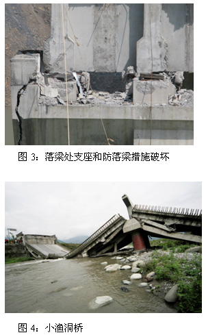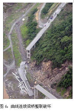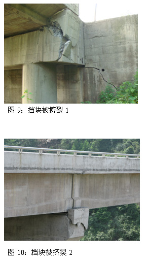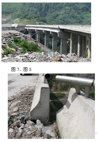 已经合龙的都汶高速公路庙子坪特大桥受损极其严重,跨中50米的简支I字型梁,整跨落入水中。说明地震时,在跨中的顺桥向变位最大,超出盖梁的宽度。顺桥向有很大的破坏力,从细部的破坏情况看,支座横桥向设置了挡块,但已破坏,顺桥向没有抗震构造措施。