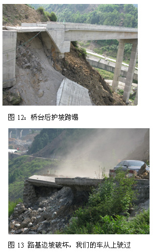 灾区桥梁的桥墩多为柔性墩,采用桩基础,基本抵御了地震力作用。但非桩柱式桥台和路基护坡均发生破坏。