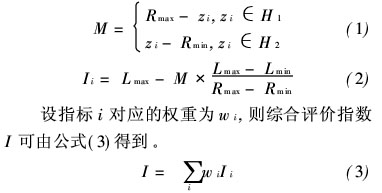 指标可分为越大越优型和越小越优型2种,记越大越优型指标集为H1,越小越优型指标集为H2。若指标i的值zi处于表1所列某区间内, 并假设该区间的临界最大值为Rmax,临界最小值为Rmin,且对应的评价等级分级区间的临界最大值为Lmax,临界最小值为Lmin,则zi对应的评价指数Ii可由式(2)得到。