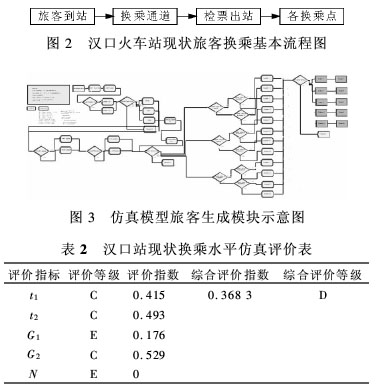 根据汉口火车站现状旅客换乘基本流程(见图2)建立了仿真模型,模型中的旅客生成模块示意图如图3所示。将调查采集到的现状输入参数输入仿真模型并运行仿真程序,所得结果如表2所列: