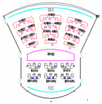 为便于工作协调,在环形调度大厅中部设置了应急指挥中心(TCC)。应急指挥中心的任务是对线网的运行情况进行监视,发布命令,协调各线路间的矛盾,遇突发事件统一指挥抢险救灾。