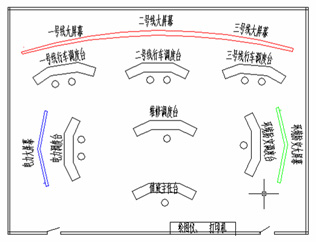 Ⅲ 每条线的行车调度员、电力调度员、环控防灾调度员共用一套投影大屏幕,调度台按前后顺序排列,后排的使用效果较差。