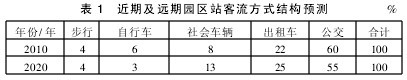 根据园区综合交通规划交通方式结构预测结果,并参考苏州火车站、汽车站客流到达方式,得出近期及远期园区站的客流方式结构(见表1)。根据园区站近期及远期客运量、客流吸发量及客流方式结构分析,得到近期及远期基地高峰小时机动车吸发量预测结果。