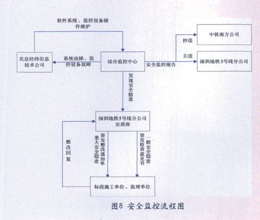 安全监控子系统的范围包括施工单位、地方建设局、轨道交通建设指挥部等。系统实现了实时监控、图像存储、回放、截图等功能。深圳地铁5号线监控中心安排管理人员24小时值班,通过监控中心及时发现现场的问题,对施工单位的不规范施工行为发出整改通知单,限时要求整改。视频系统每周都会有周报,如果出现的问题没有严重违章,就会有截图附在上面;如果有比较重大的问题,就会及时下发整改要求。