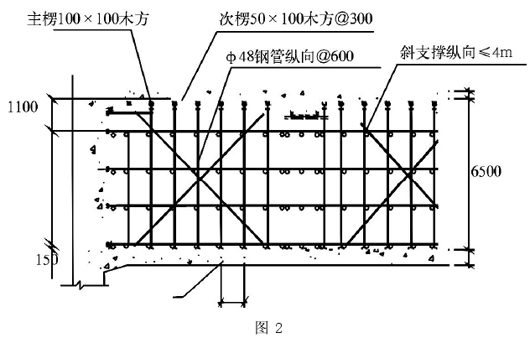 采用ф48×3.5碗扣架管,根据主楞与次楞跨距平面布置间距为600×850mm,上设U托,最下一层地杆距地150mm,中间水平支撑间距小于1200mm。