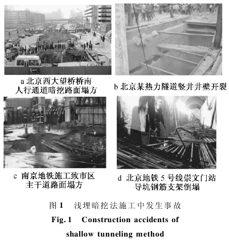 图 1 为采用浅埋暗挖法施工的实例,其中图 1d文门环线地铁,在地下施工时要保证施工安全的难度很大。支撑钢筋的剪刀撑突然滑脱导致整个底梁钢筋倾覆是这次事故的主要原因。工人没有选择合适的逃生方式,没有向外跑反而向里跑也是事故的一个原因。