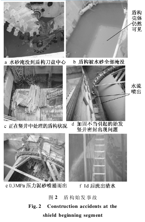 某综合管廊隧道处于含水砂层中,采用盾构法修建,内径 5. 5m、外径 6. 1m,覆土层厚约 14m。始发井端部土层采用旋喷桩注浆加固,由于加固不当,盾构没有始发即被淹没在竖井中(见图 2)。