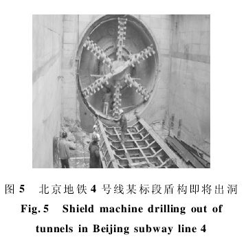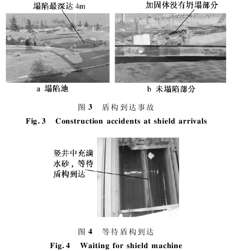 盾构机到达接收井外土体为含水砂层,因加固长度不足及加固质量差,引起地面塌陷(见图 3),盾构到达无法正常进行,导致接收井中充满水砂(见图 4),另外还导致盾构出洞及接收井外地面沉陷等。图 5,6 为北京地铁 4 号线某标段盾构即将出洞,在等待进入接收井时,由于端头地层加固不良及污水管渗漏导致地面塌陷。