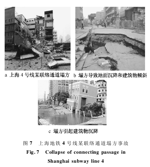 例如上海地铁 4 号线某联络通道施工时,由于停电导致冻结帷幕融化,引起隧道结构垮塌及地面塌陷、楼房倒塌、地下管线断裂等严重事故,如图 7所示。