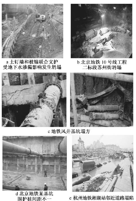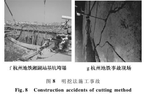 通过对明挖法施工基坑事故的风险分析可知,明挖法施工容易导致的安全事故大致可分为 10 种:①基坑侧壁渗漏;②支撑系统失稳;③坑底隆起破坏;④围护结构整体失稳;⑤坑底管涌、流砂;⑥坑内滑坡;⑦围护结构折断或大变形;⑧周围建(构) 筑物损伤或破坏;⑨路面破坏;⑩人员伤亡及财产损失。前 7 项最终结果是导致基坑坍塌、周围建(构)筑物、地下管线破坏以及人员伤亡,图 8 为近年来各地明挖法施工中发生的事故。