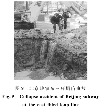 管线破损 (破坏) 或渗漏安全事故比例较大。在近几年北京地铁施工发生的 46 例事故中,有 12例是由管线渗漏或破裂造成的,占总案例的 28% 。其中,电力管线(或电缆)破坏 4 例,意外水害(上层滞水)1 例,其余则是因雨(污)水管线、上水管线破裂或渗漏造成地面或基坑的塌陷事故。