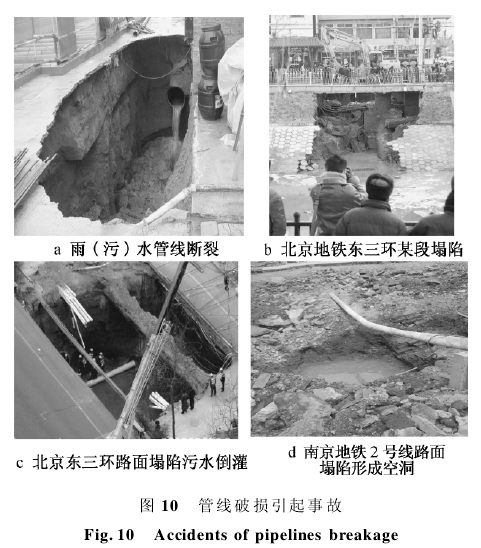 2)后果严重,社会影响大 由于地铁车站和区间线路基本与地面主要交通干线连接,且周围存在大量的居民楼或办公楼。由于管线的破裂造成居民停水、停电、中断通信信号以及发生交通阻塞,社会影响极大,图 10 为因管道破损而引起的重大事故。