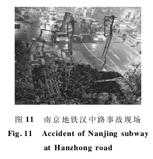 图 11 为南京地铁汉中路事故现场,专家分析其造成原因认为,由于汉中路沿线地下存在许多“盲管”,特别是年代久远的老污水管道,基本是放任污水在地下渗漏。正是这些渗漏的污水导致土壤流失,加上附近复杂的地质条件,形成空洞,造成坍塌。