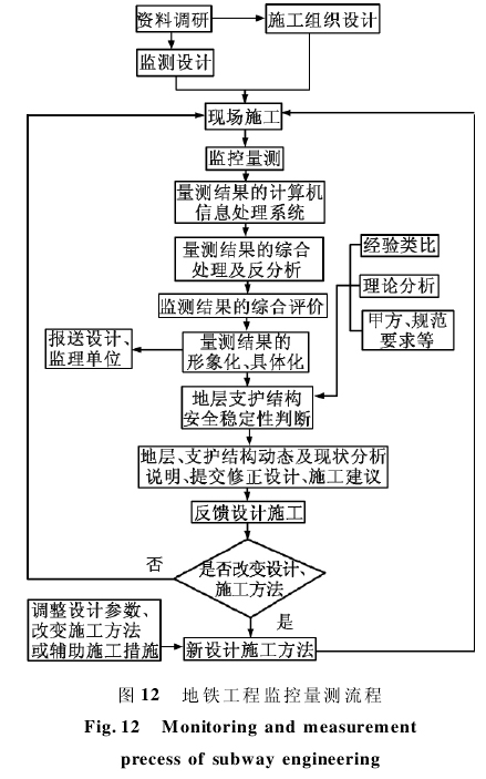 应认真做好地铁工程的监测工作。地铁工程施工中监控量测是保障工程安全、质量及道路、沿线建(构)筑物、地下管线等正常运作的重要手段,可以很好地掌握围岩动态和初期支护结构工作状态,利用量测结果修改设计和指导施工,遇见事故险情,以便及时采取相应对策,为隧道、基坑和环境安全提供可靠信息。地铁工程监控量测流程如图 12 所示。