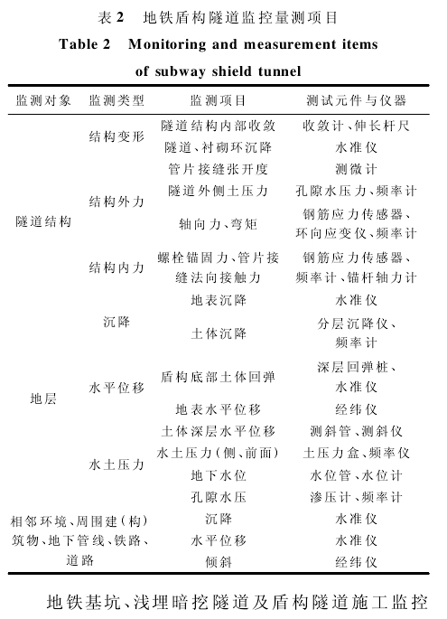 盾构隧道监测对象主要是土体介质、隧道结构和周围环境,监测部位包括地表、土体内、盾构隧道结构以及周围道路、建筑物和地下管线等,监测类型主要是地表和土体深层的沉降和水平位移、地层水土压力和水位变化、建筑物和管线及其基础等的沉降和水平位移、盾构隧道结构内力、外力和变形等,具体如表 2 所示。